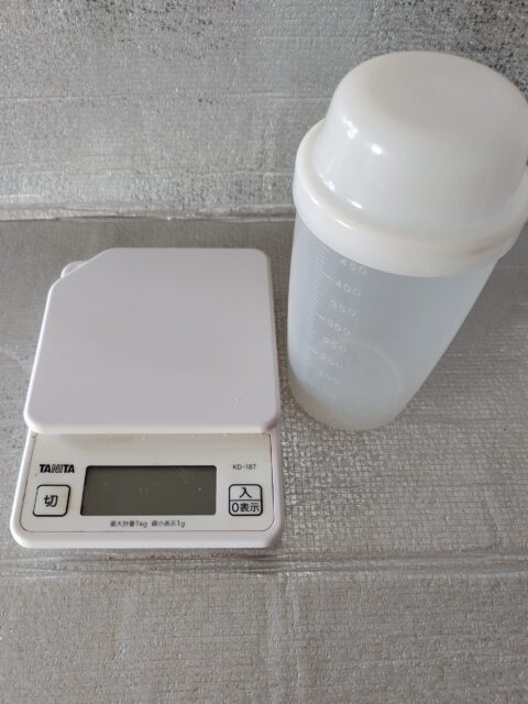 マルチシェイカーの蓋の溝あたりまで入れるとヘナ約50g、下の溝で約40gになります。この目安にすると計り、スケールはいりません。